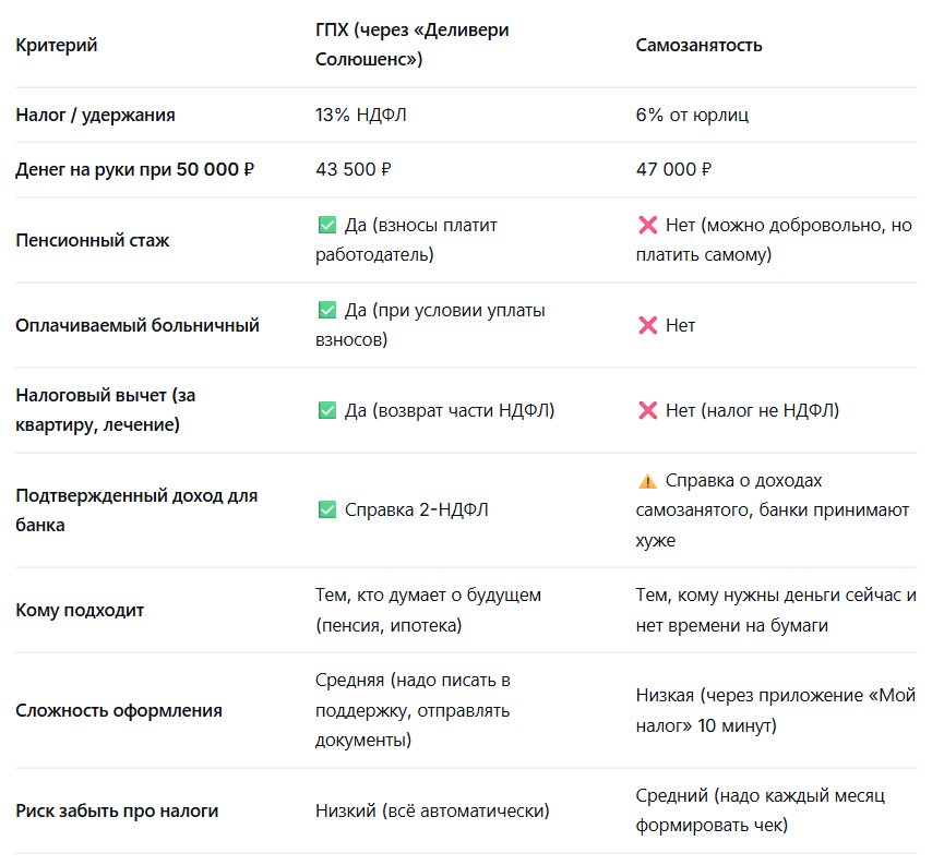 Сравнение: ГПХ vs Самозанятость, таблица для быстрого выбора